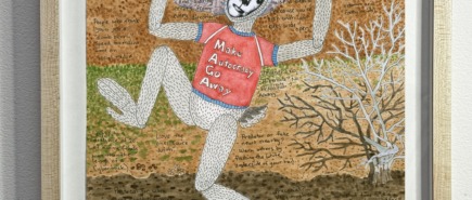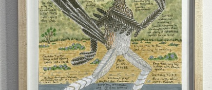 AKA: How To Be A Greater Roadrunner, ink, watercolor, collage on paper, 12” x 9” (15” x 12” framed in natural poplar), 2025. $POR.
