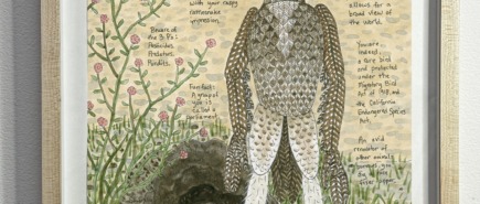 AKA: How To Be A Burrowing Owl, ink, watercolor, collage on paper, 12” x 9” (15” x 12” framed in natural poplar), 2025. $POR.