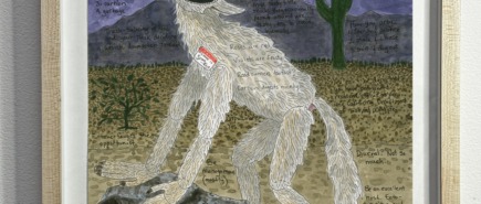 AKA: How To Be A Coyote, ink, watercolor, collage on paper, 12” x 9” (15” x 12” framed in natural poplar), 2025. $POR.