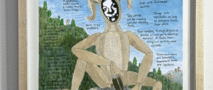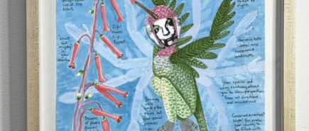 AKA: How To Be An Anna’s Hummingbird, ink, watercolor, collage on paper, 12” x 9” (15” x 12” framed in natural poplar), 2025, $POR.