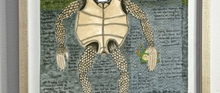 AKA: How To Be A Desert Tortoise, ink, watercolor, collage on paper, 12” x 9” (15” x 12” framed in natural poplar), 2025. $POR.