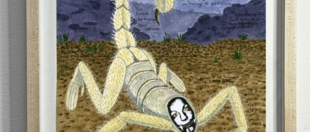 AKA: How To Be A Giant Desert Hairy Scorpion, ink, watercolor, collage on paper, 12” x 9” (15” x 12” framed in natural poplar), 2025. $POR.