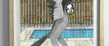 AKA: How To Be A Mocking Bird, ink, watercolor, collage on paper, 12” x 9” (15” x 12” framed in natural poplar), 2025. $POR.