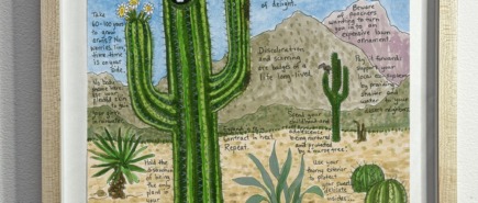 AKA: How To Be A Saguaro, ink, watercolor, collage on paper, 12” x 9” (15” x 12” framed in natural poplar), 2025. $POR.