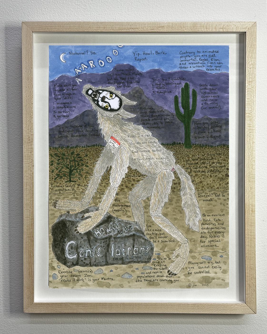 How To Be Canis latrans AKA: How To Be A Coyote, ink, watercolor, collage on paper, 12” x 9” (15” x 12” framed in natural poplar), 2025. $POR.