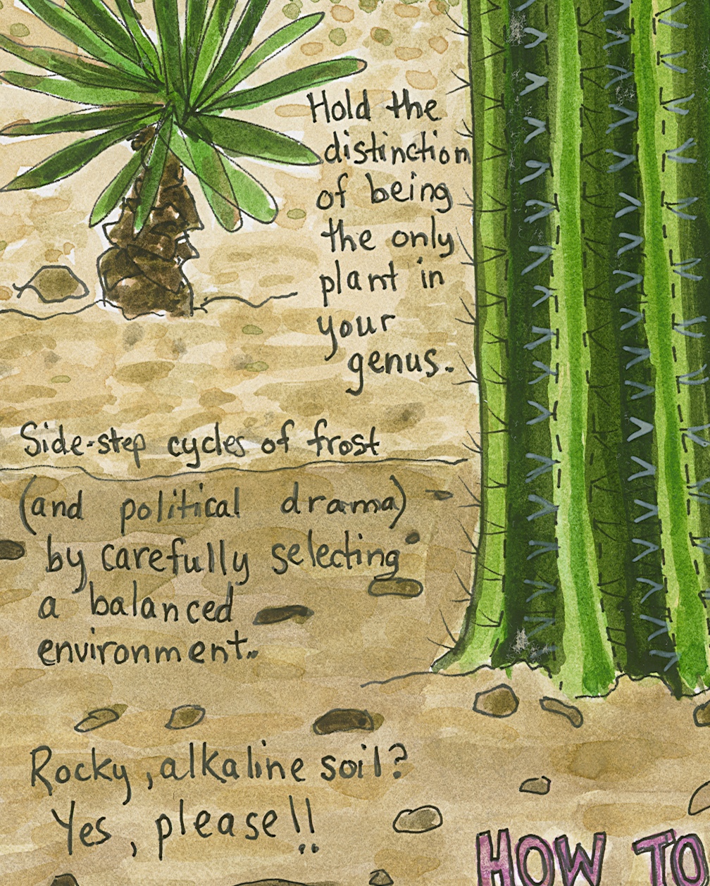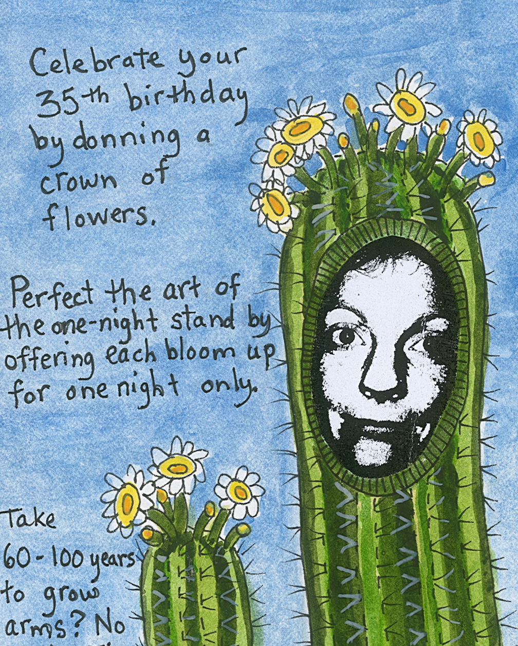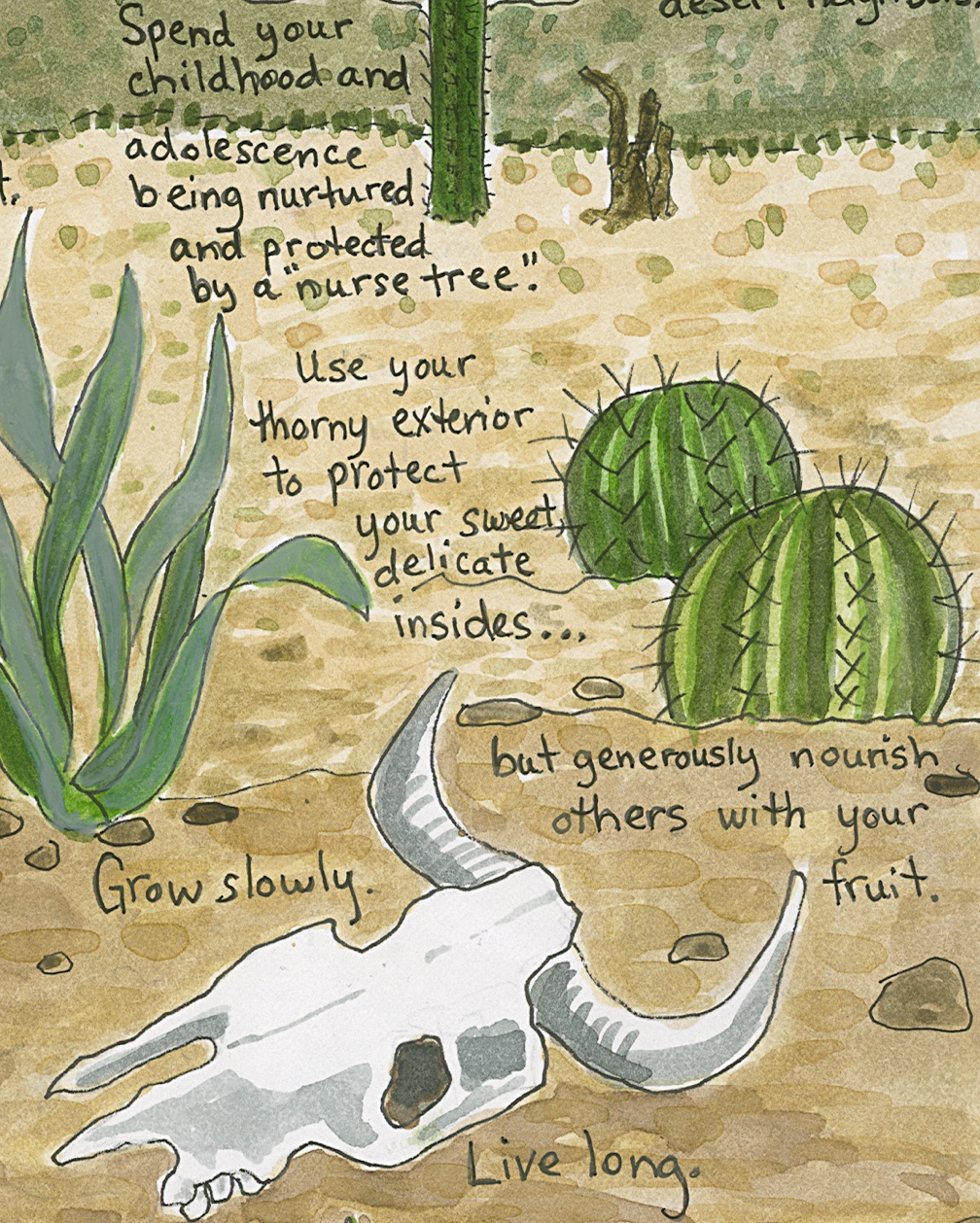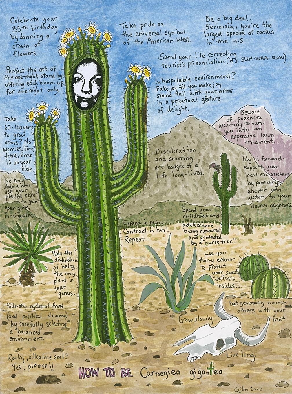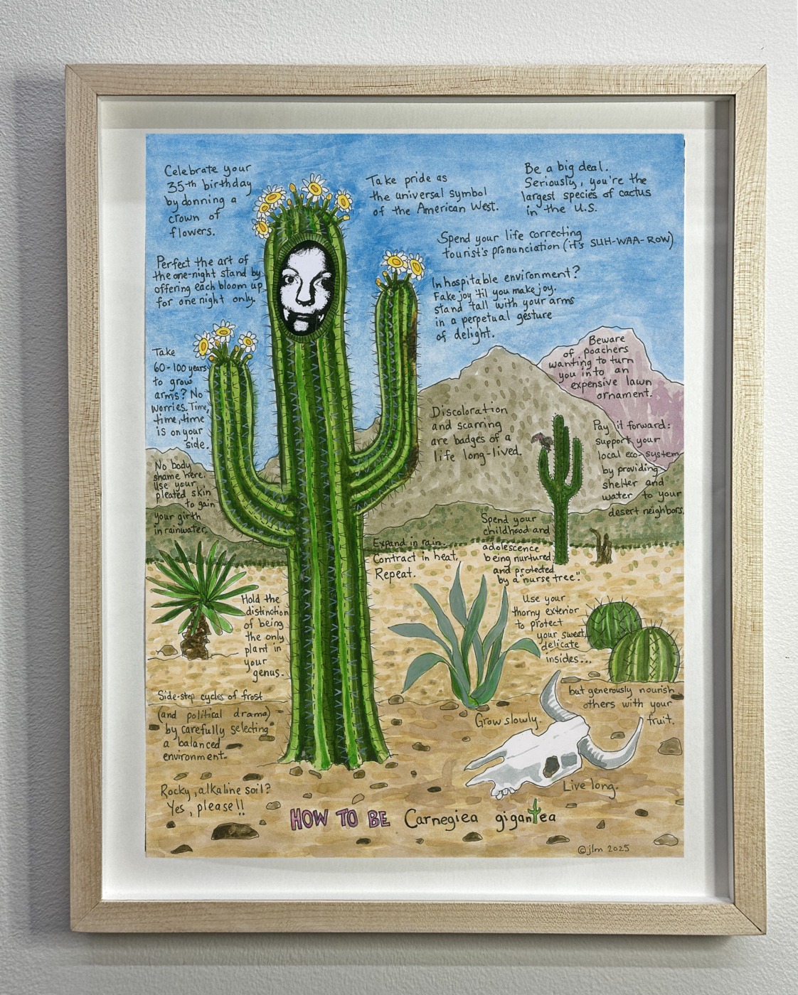 How To Be Carnegiea gigantea AKA: How To Be A Saguaro, ink, watercolor, collage on paper, 12” x 9” (15” x 12” framed in natural poplar), 2025. $POR.