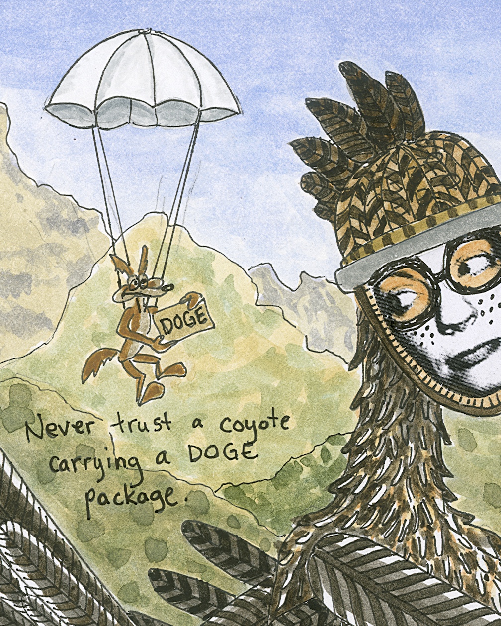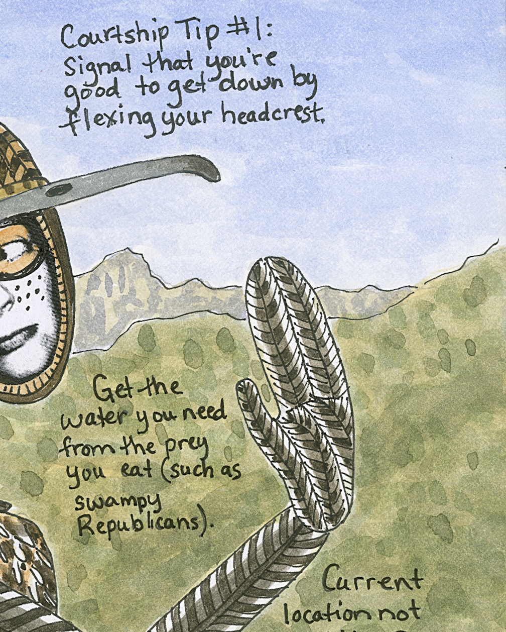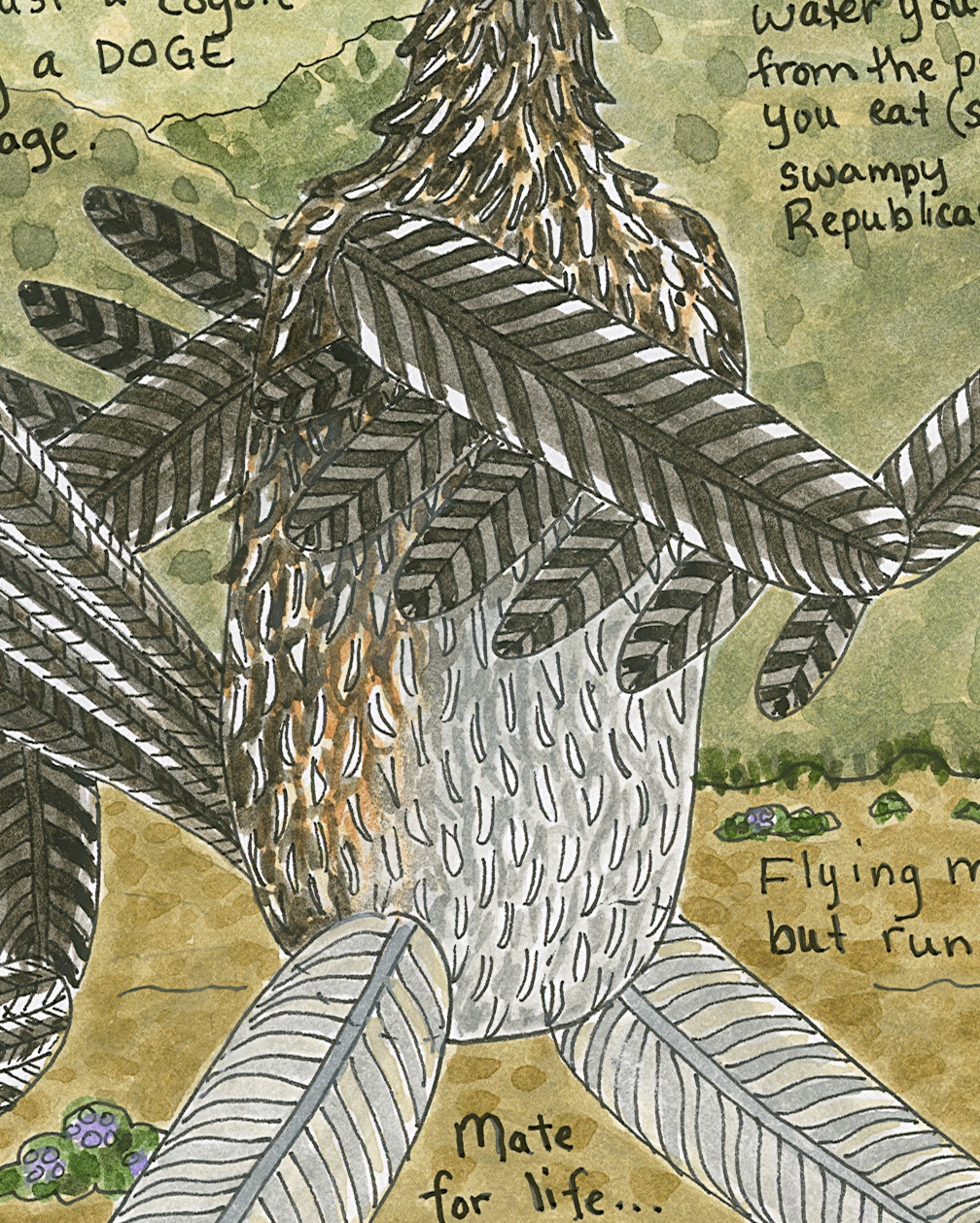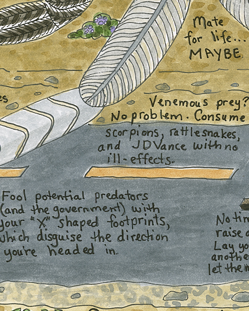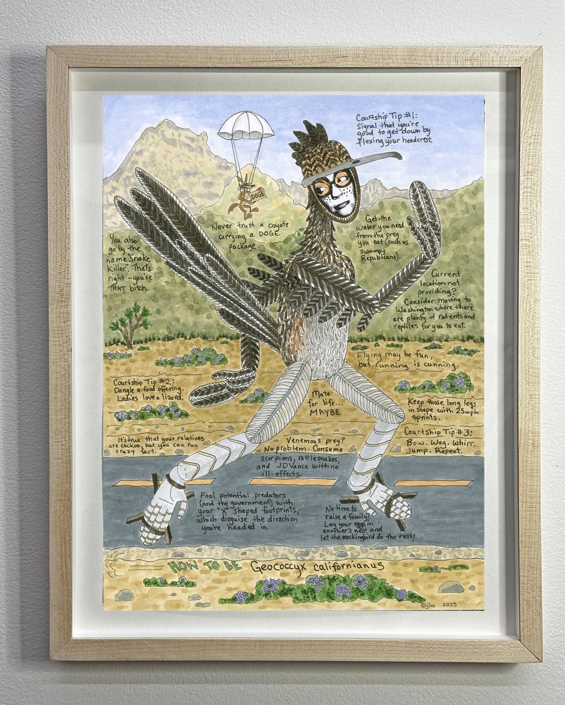 How To Be Geococcyx californianus AKA: How To Be A Greater Roadrunner, ink, watercolor, collage on paper, 12” x 9” (15” x 12” framed in natural poplar), 2025. $POR.