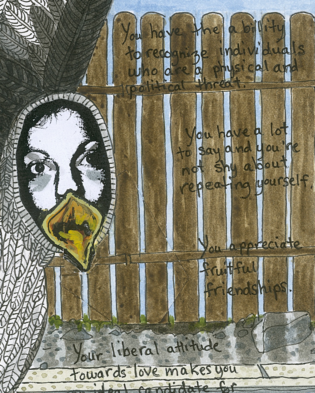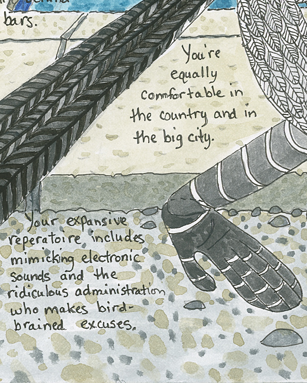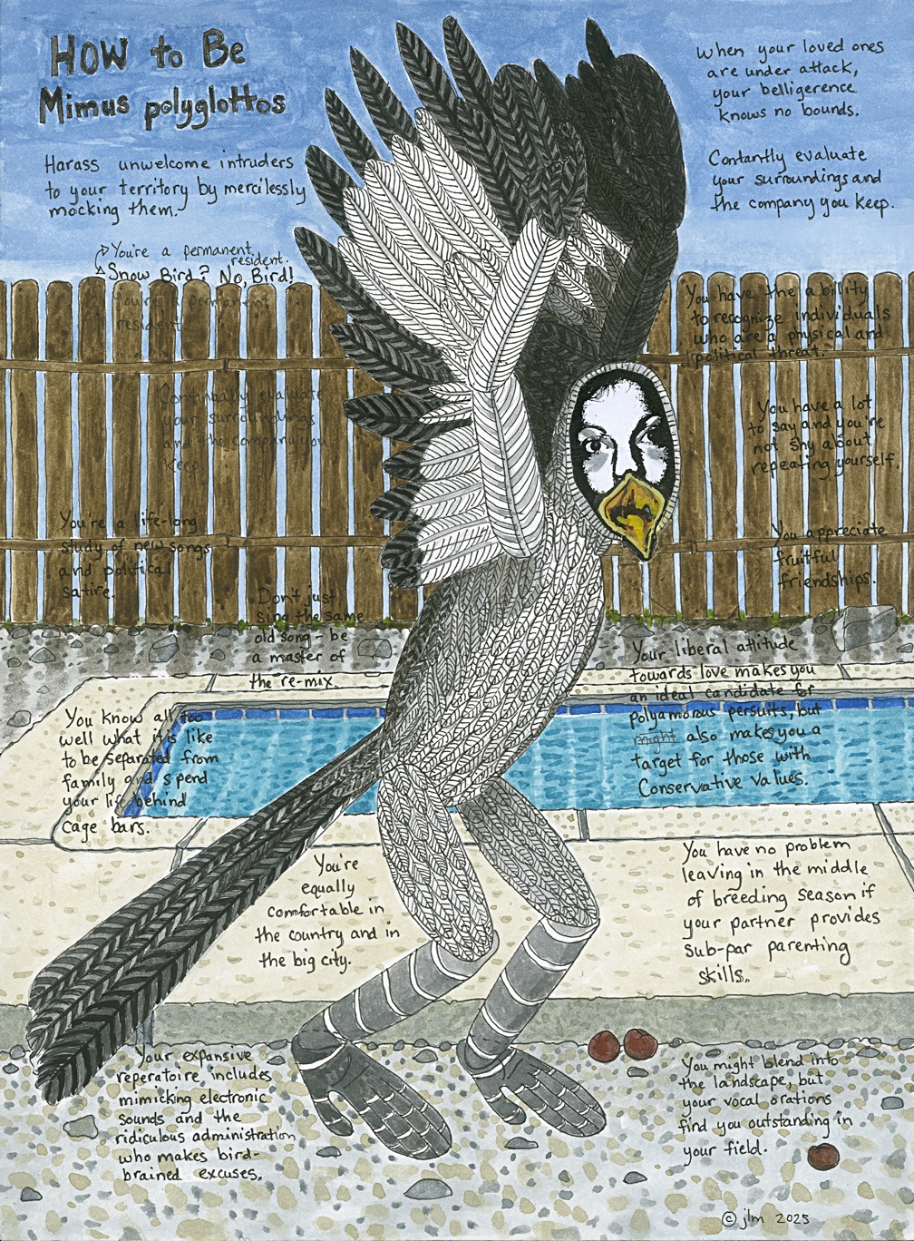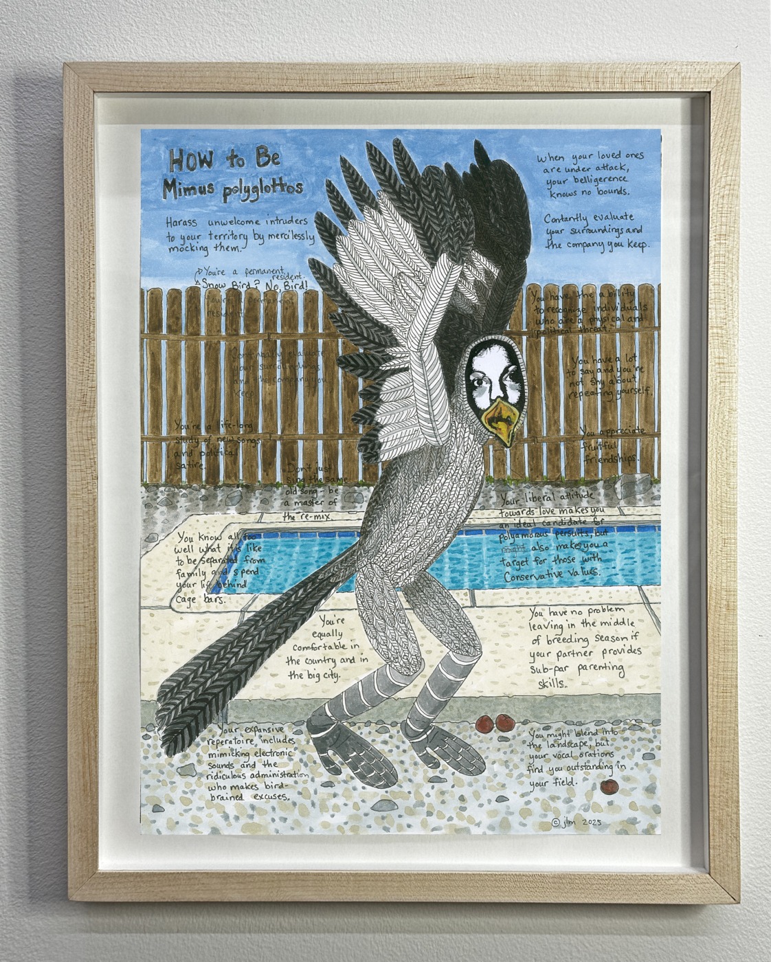 How To Be Mimus polyglottos AKA: How To Be A Mocking Bird, ink, watercolor, collage on paper, 12” x 9” (15” x 12” framed in natural poplar), 2025. $POR.