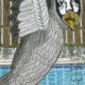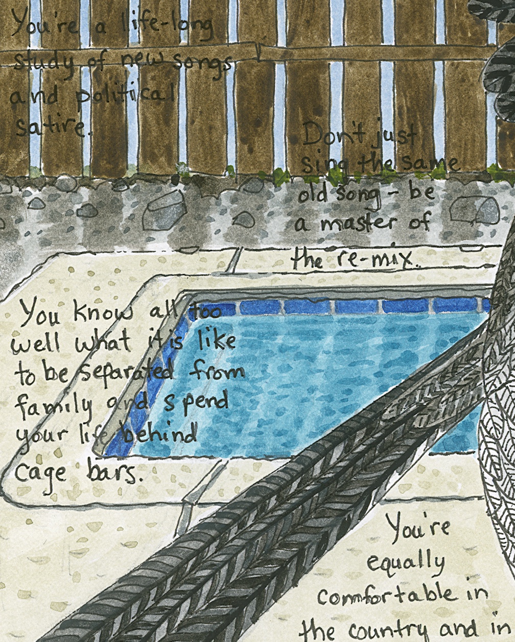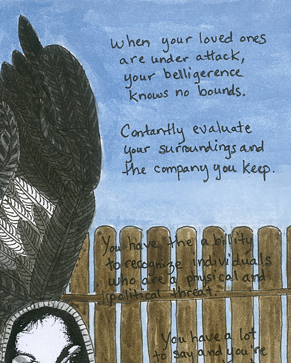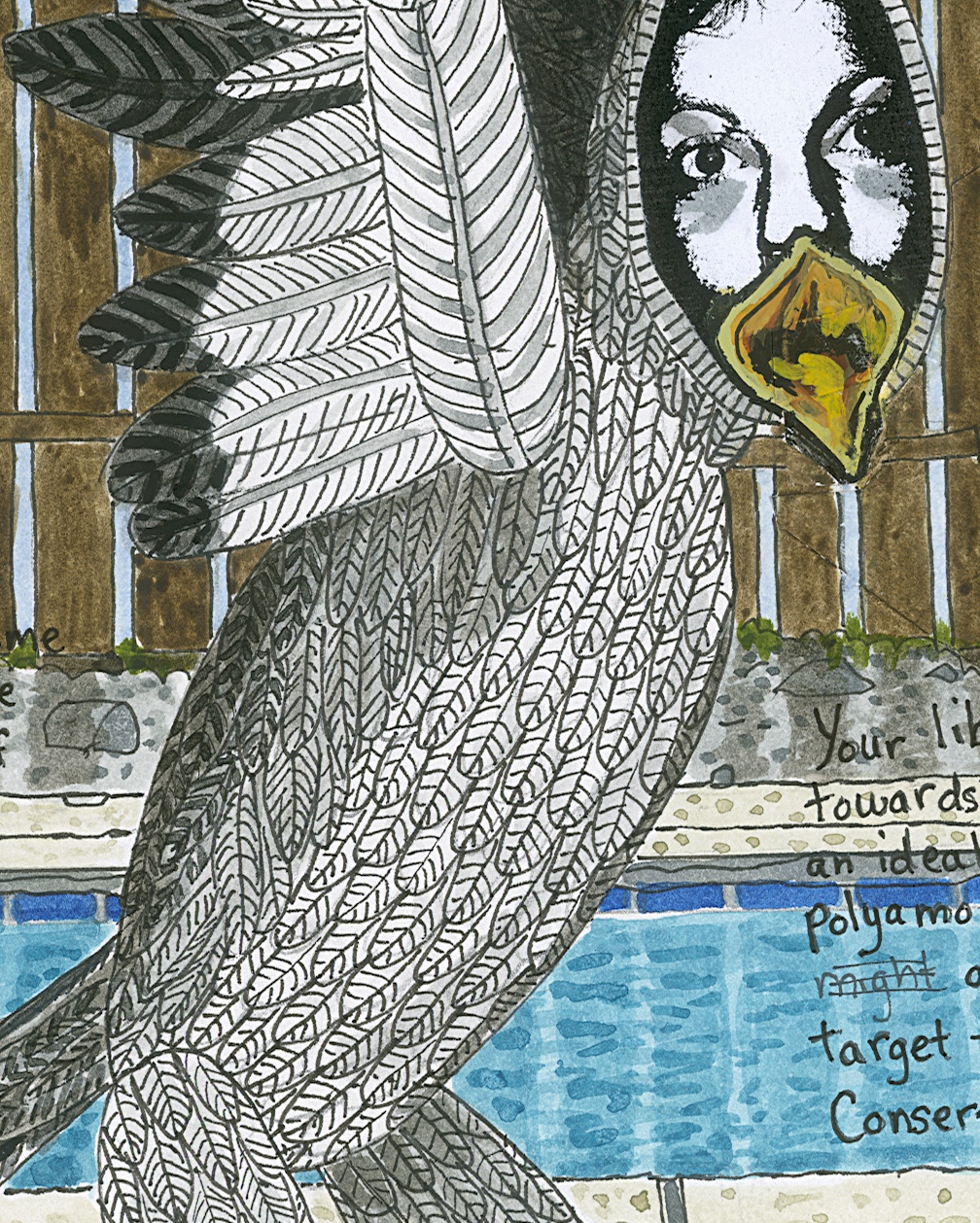 How To Be Mimus polyglottos AKA: How To Be A Mocking Bird, ink, watercolor, collage on paper, 12” x 9” (15” x 12” framed in natural poplar), 2025. $POR.