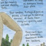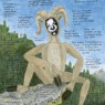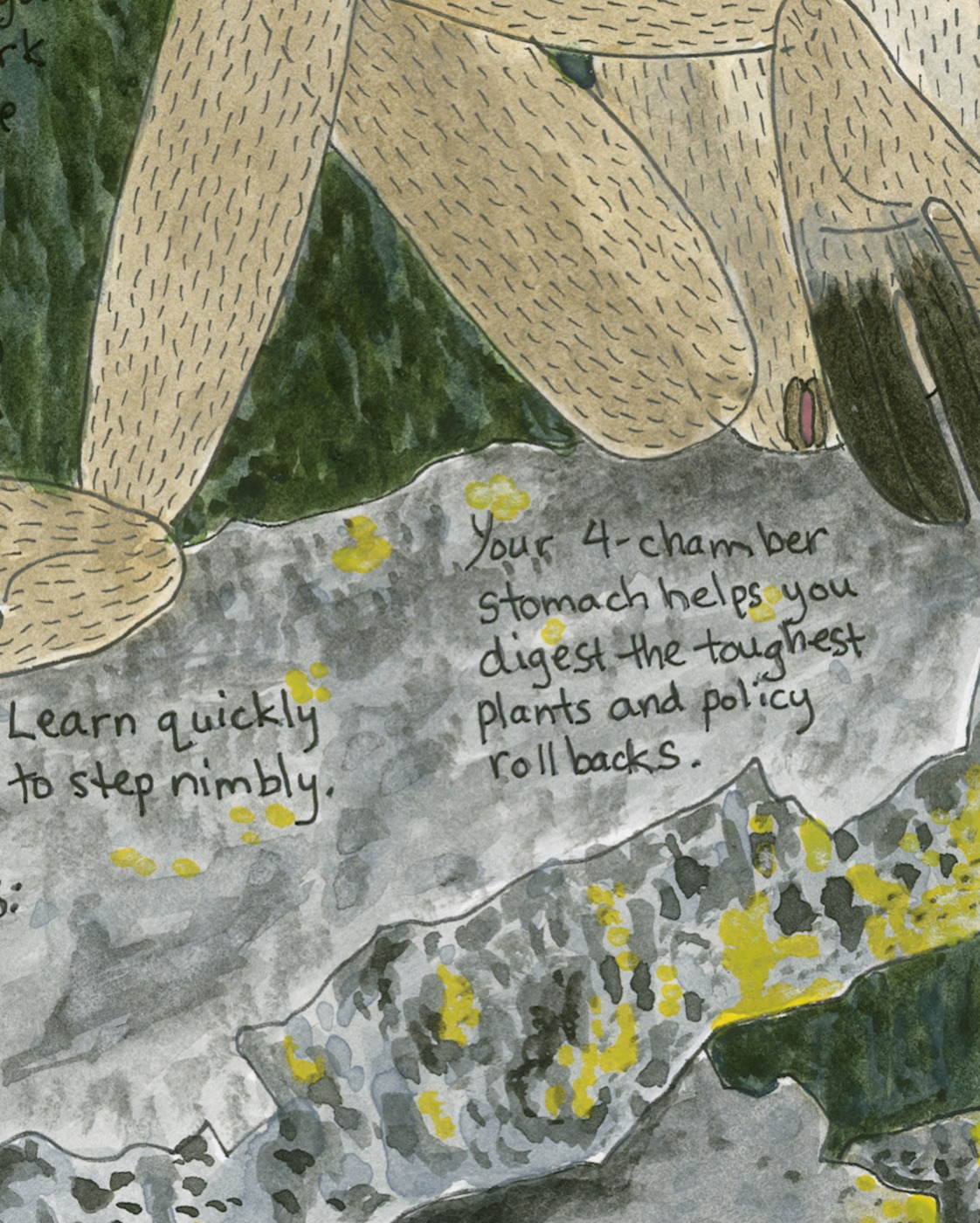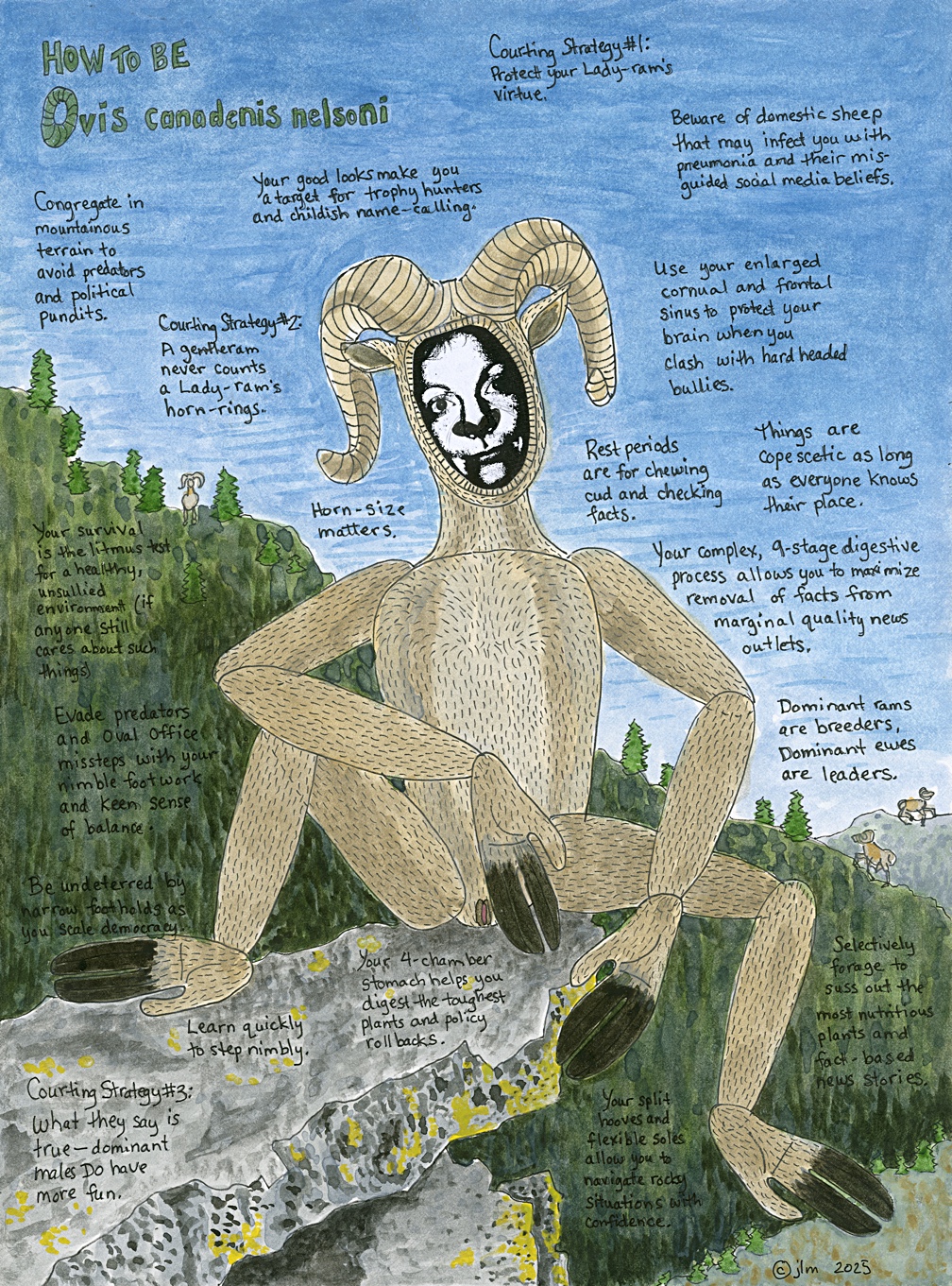 How To Be Ovis canadenis nelsoni AKA: How To Be A Desert Bighorn Sheep, ink, watercolor, collage on paper 12” x 9” (15” x 12” framed in natural poplar), 2025. $POR.