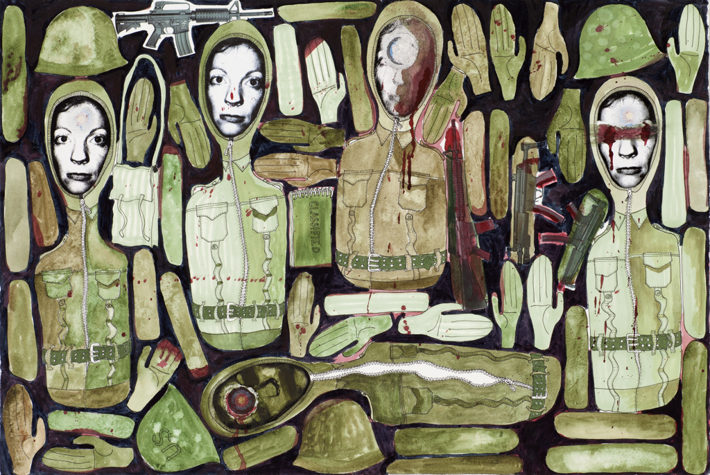 Paper, collage, ink, watercolour, thread, Duralar, wire, 12.5″x16.5″x1″ (framed in a 16″x20″x1.5″ frame), 2017. This piece is available for purchase. $1,800.00.